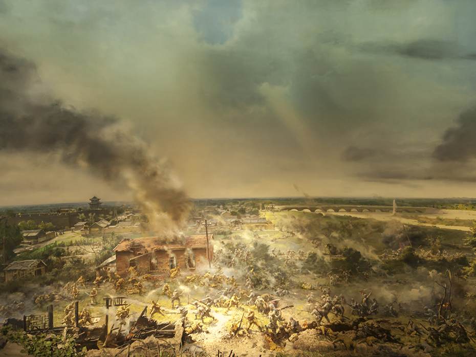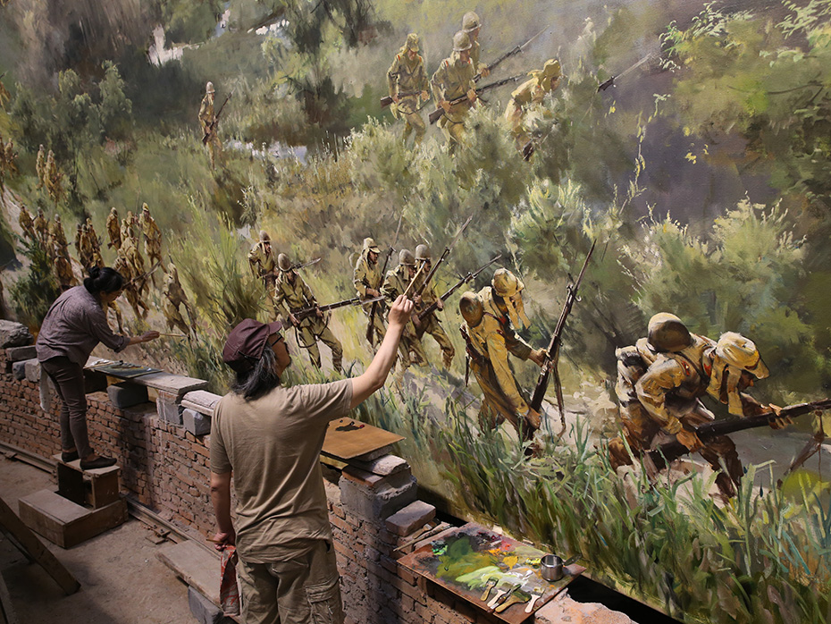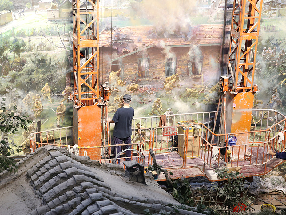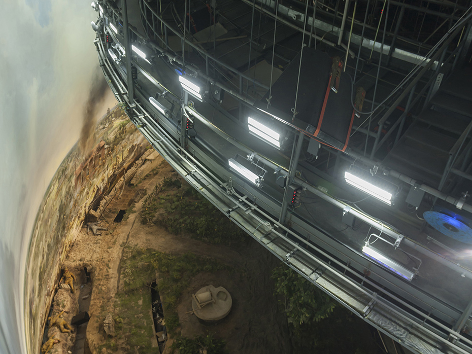 抗战胜利70周年抗战馆半景画馆画面修复及灯光音响效果(定制全部照明及效果灯具,定制虚拟环绕声系统,采用E:CUE控制)。