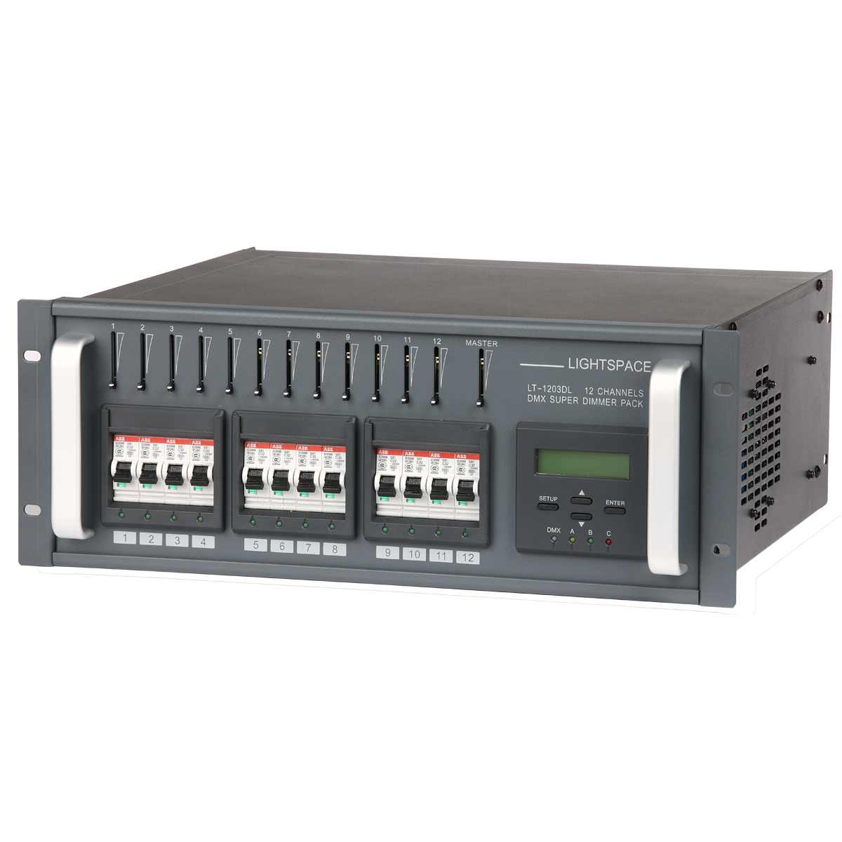 LT-1203DL 12路数字调光器可安装于19”标准机柜和航空箱,4U机箱设计,适用作为流动设备,小型演播厅,中小型娱乐场所,及建筑照明。每路设有电位器可独立使用和操作,高速MCB及大功率可控硅,可有效?;ざ搪芬鸬目煽毓杌鞔?。调光器内设有智能温控风扇散热控制,每路可设为可控直通,有4条调光曲线可供选择,后面板可选多种插座形式。