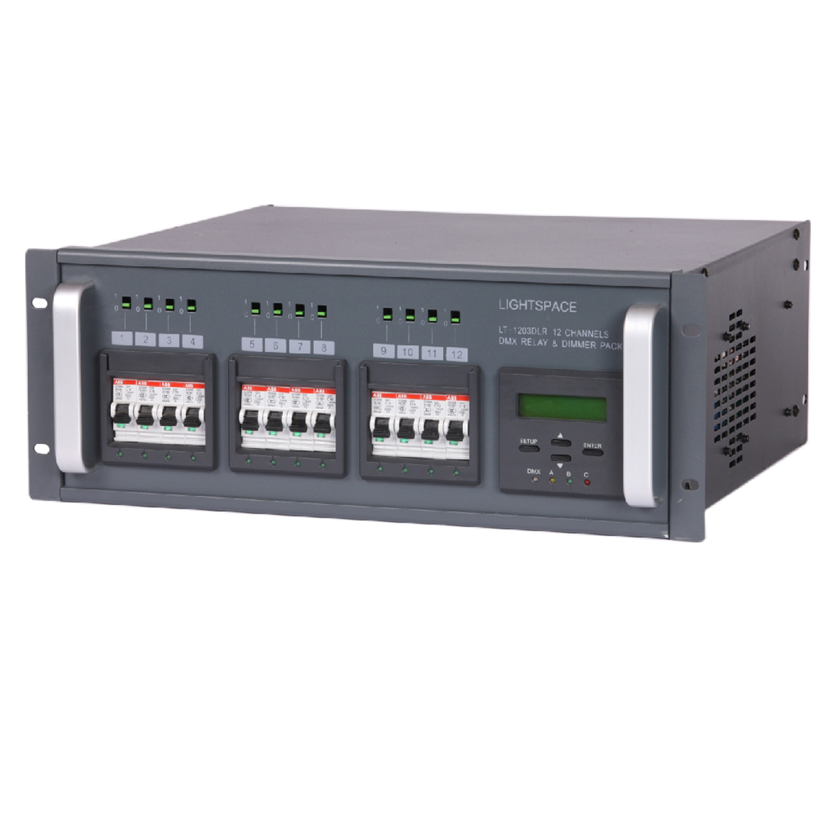 LT-1203DLR 12路调光/开关两用数字调光器可安装于19”标准机柜和航空箱,4U机箱设计,适用作为流动设备,小型演播厅,中小型娱乐场所,及建筑照明。每路MCB过载?;ぃ捎么疟3旨痰缙?,DMX-512控制每路的通断,每路也可手动控制直通的开关,每路可设为可控和不可控直通,后面板可选多种插座形式。