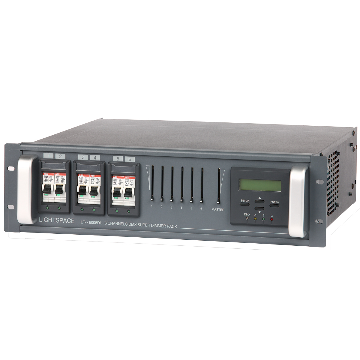 LT-6006DL 6路数字调光器。可安装于19”标准机柜和航空箱,3U机箱设计,适用作为流动设备,小型演播厅,中小型娱乐场所,及建筑照明。每路设有电位器可独立使用和操作,高速MCB及大功率可控硅,可有效?;ざ搪芬鸬目煽毓杌鞔5鞴馄髂谏栌兄悄芪驴胤缟壬⑷瓤刂?,每路可设为可控直通,有4条调光曲线可供选择,后面板可选多种插座形式。