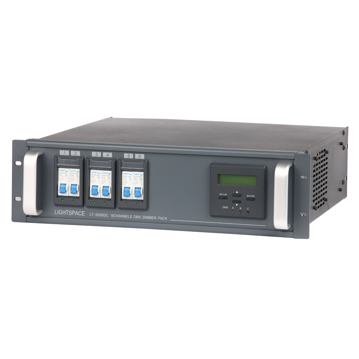 LT-6006DC 6路数字调光器可安装于19”标准机柜和航空箱,3U机箱设计,适用作为流动设备,小型演播室,中小型娱乐场所。MCB过载?;ぁ5鞴馄髂谏栌兄悄芪驴胤缟壬⑷瓤刂?,每路可设为可控直通,有4条调光曲线可供选择,后面板可选多种插座形式。