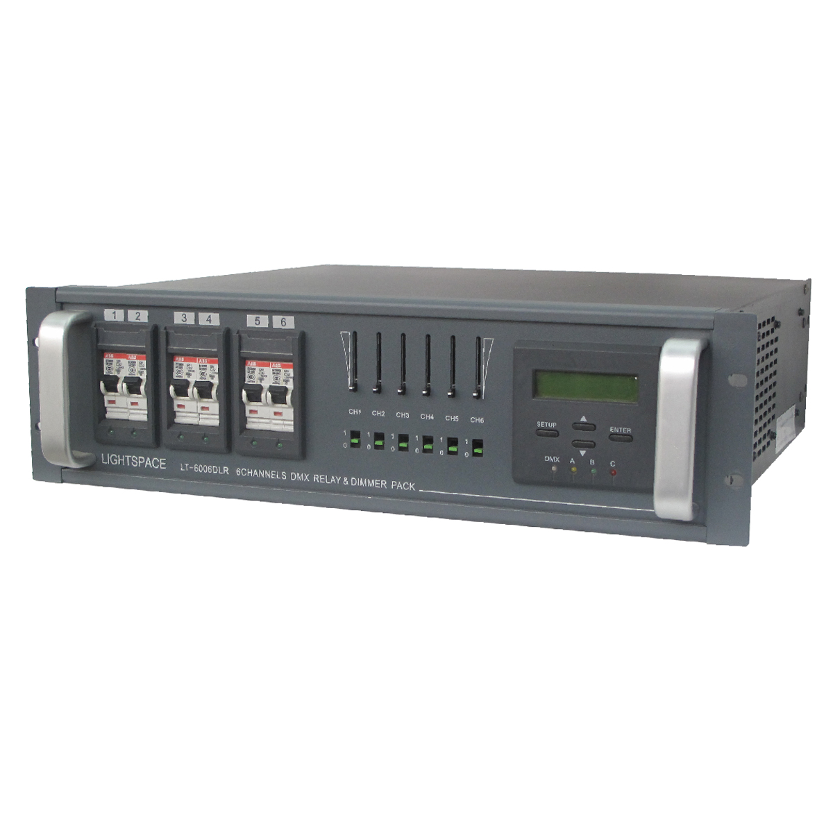 LT-6006DLR 6路调光/直通两用数字调光器可安装于19”标准机柜和航空箱,3U机箱设计,适用作为流动设备,小型演播厅,中小型娱乐场所。每个输出回路除有可控硅外,还有一磁保持继电器,调光-直通两用,切换方便;可方便在传统调光、可控直通间切换输出方式。设有电位器可独立使用和操作,高速MCB及大功率可控硅,可有效?;ざ搪芬鸬目煽毓杌鞔5鞴馄髂谏栌兄悄芪驴胤缟壬⑷瓤刂?,每回路可在界面中独立设置为可控直通或调光,有4条调光曲线可供选择,后面板可选多种插座形式。
