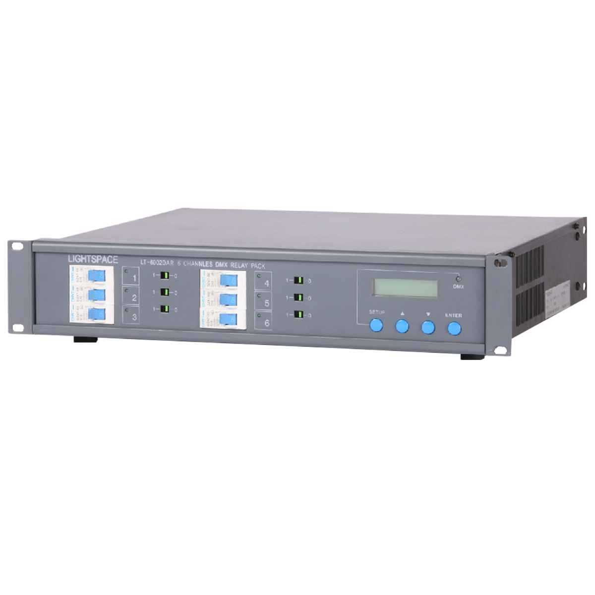 LT-6002DAR 6路开关控制器可安装于19”标准机柜和航空箱,2U机箱设计,适用作为流动设备,小型演播厅,中小型娱乐场所,及建筑照明。磁保持继电器,可在断电/上电后,保持原状态,在控制系统出现故障时,每路可手动控制作为紧急直通开关。后面板可选多种插座形式。