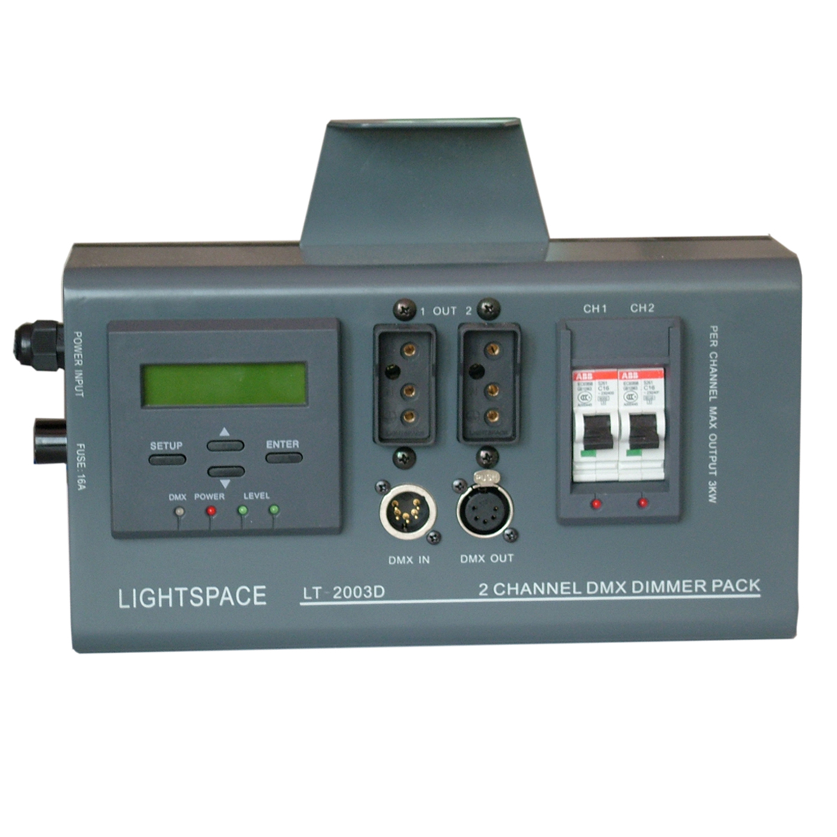 LT-2003D 2路数字调光器采用挂杆式设计,可安装在吊杆上使用,适用作为流动设备,小型演播厅,中小型娱乐场所,及建筑照明。高速MCB及大功率可控硅,可有效保护短路引起的可控硅击穿。调光器为自然散热,每路可设为可控直通,有4条调光曲线可供选择,输出采用3芯16A专业插座。